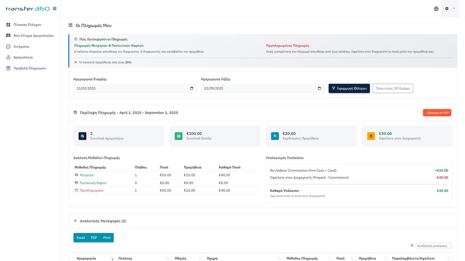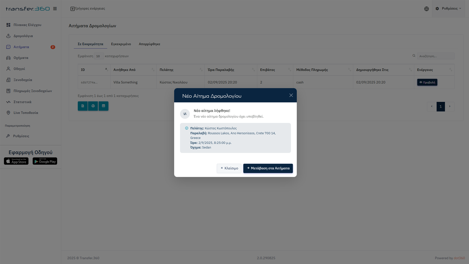 Το Transfer.360 είναι μια ολοκληρωμένη πλατφόρμα διαχείρισης δρομολογίων για επαγγελματίες οδηγούς, ξενοδοχεία και τουριστικές επιχειρήσεις. Παρέχει εφαρμογή οδηγού και διαχειριστικό πάνελ για τη βέλτιστη οργάνωση και παρακολούθηση των μετακινήσεων.