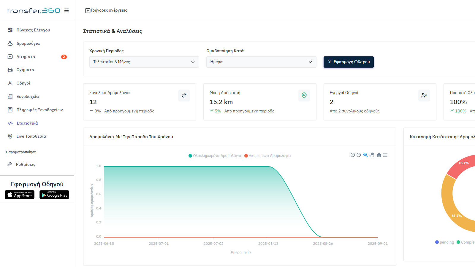 Το Transfer.360 είναι η νέας γενιάς πλατφόρμα που μεταμορφώνει τον τρόπο διαχείρισης των δρομολογίων σας. Με προηγμένη τεχνητή νοημοσύνη, real-time παρακολούθηση και ολοκληρωμένα εργαλεία διαχείρισης, προσφέρουμε την απόλυτη λύση για εταιρείες τουριστικών μεταφορών, ξενοδοχεία και τουριστικές επιχειρήσεις.